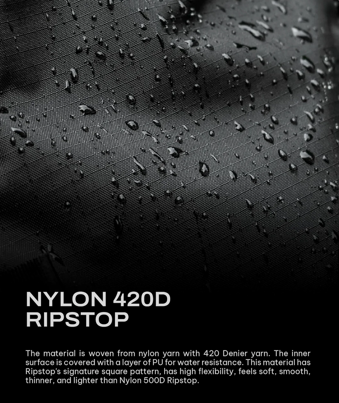 Built from Ripstop Nylon 420D - High tenacity nylon that's strong yet as light as air. It is suitable for a wide range of applications that require lightweight durability, making it popular for camping and outdoor gear, and even student backpacks.