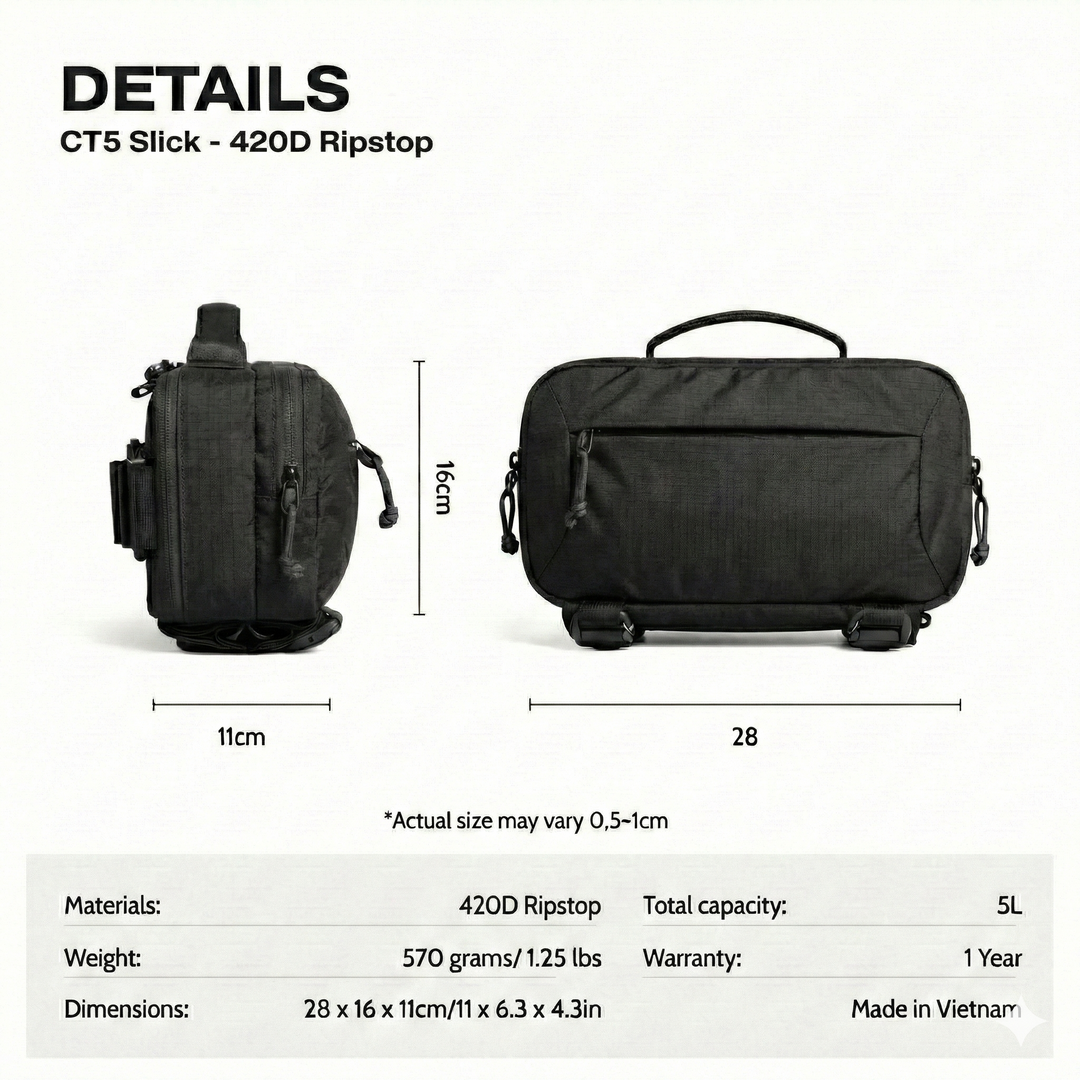 The CT5 Slick is a streamlined version of our best-selling EDC sling. This version is for those who love the combination of superior durability and practicality, boasting thoughtful upgrades designed to enhance your everyday carry experience.